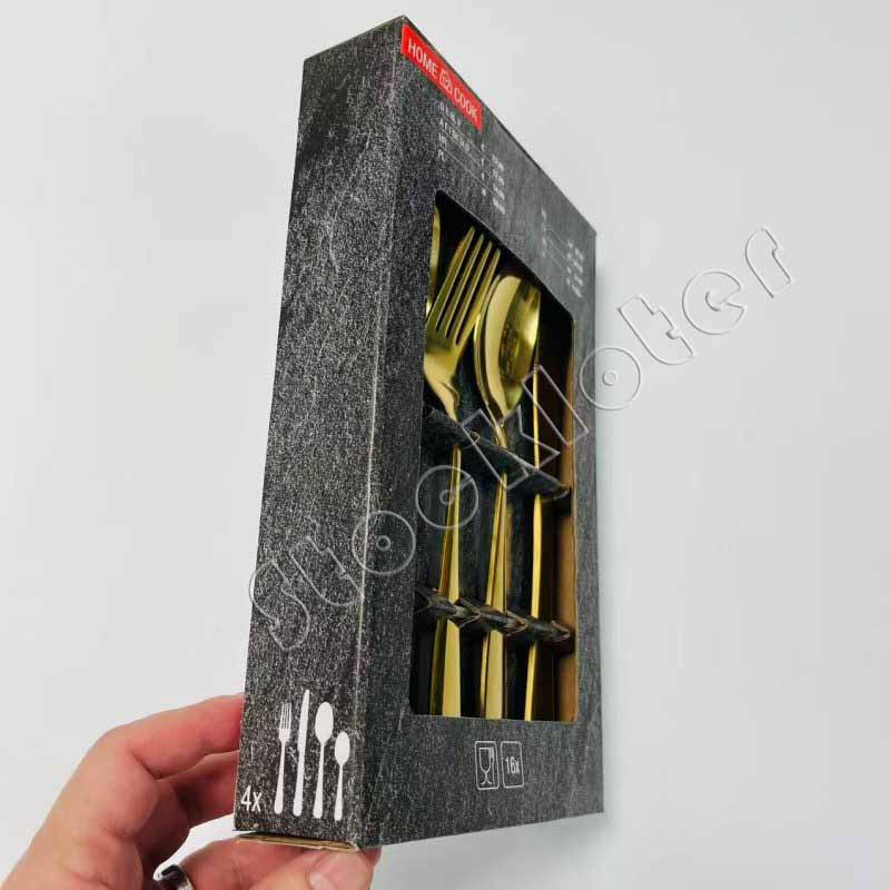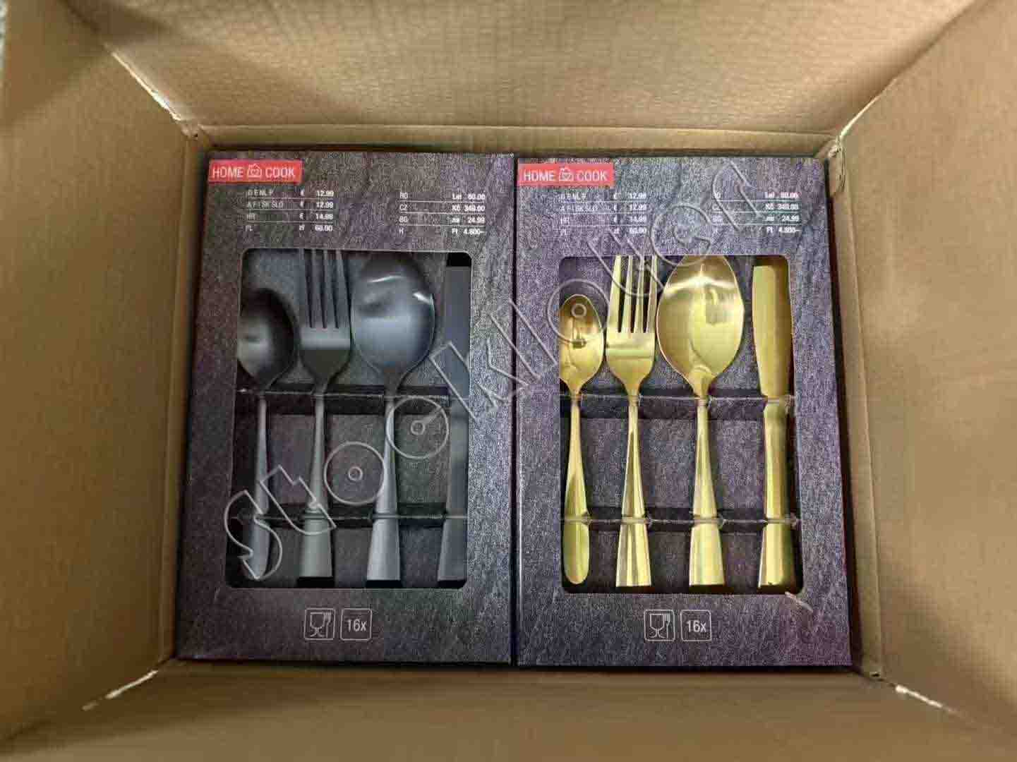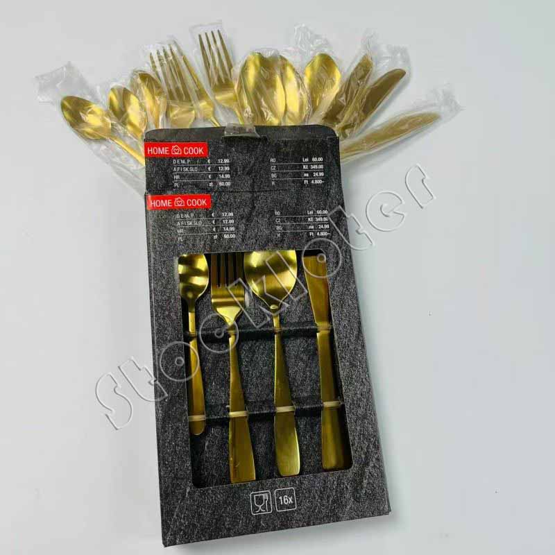 Цвета и Спец.: В наборе 16 предметов: 4 ложки, 4 ножа, 4 вилки и 4 чайные ложки. Два цвета: золотой и темно-серый.